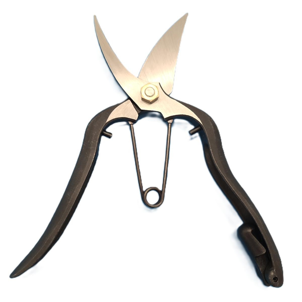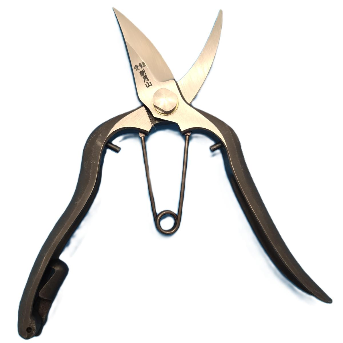 Sécateur japonais traditionnel en acier carbone de marque SHINGASAN, très léger et acéré. Angle B. Longueur 185 mm pour les petites mains (existe aussi en version 200 et 225 mm avec des lames plus classiques).